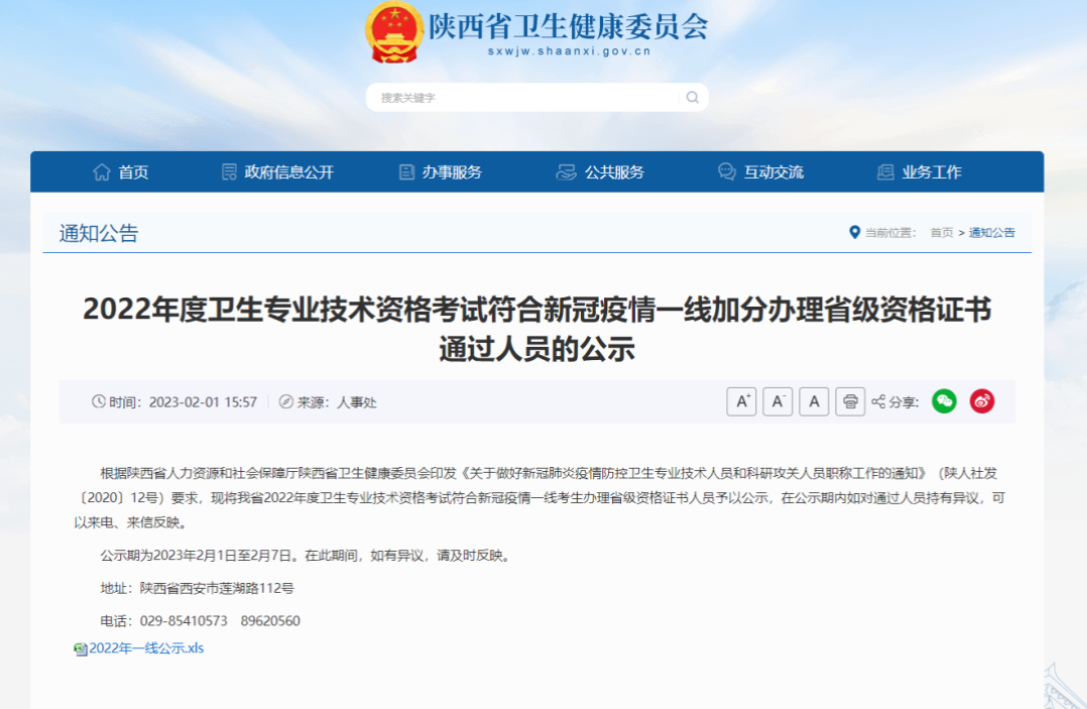 近日,陕西省卫健委发布了《2022年度卫生专业技术资格考试符合新冠疫情一线加分办理省级资格证书通过人员的公示》。