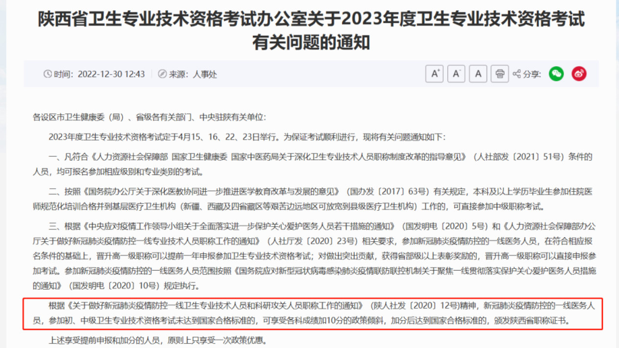 而2021年、2022年及2023年卫生专业技术资格考试公告中均明确表示:根据《关于做好新冠肺炎疫情防控一线卫生专业技术人员和科研攻关人员职称工作的通知》(陕人社发〔2020〕12号)精神,新冠肺炎疫情防控的一线医务人员,参加初、中级卫生专业技术资格考试未达到国家合格标准的,可享受各科成绩加10分的政策倾斜,加分后达到国家合格标准的,颁发陕西省职称证书。
