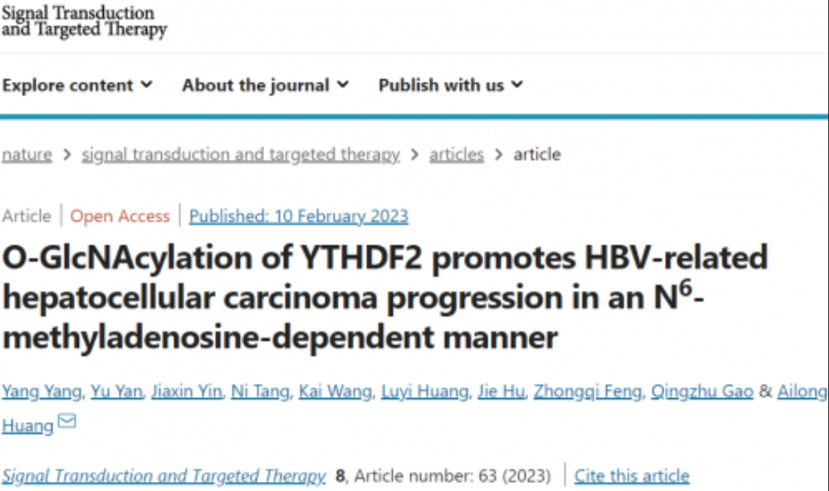 2023年2月10日,重庆医科大学黄爱龙团队在Signal Transduction and Targeted Therapy(IF=38)在线发表题为“O-GlcNAcylation of YTHDF2 promotes HBV-related hepatocellular carcinoma progression in an N6-methyladenosine-dependent manner”的研究论文,该研究表明YTHDF2的O-GlcNA酰化以N6-甲基腺苷依赖方式促进HBV相关肝细胞癌的进展。该研究发现YTHDF2 O-GlcNA酰化在HBV感染时显著增加。O-GlcNAc转移酶(OGT)介导的YTHDF2丝氨酸263上的O-GlcNAc酰化通过抑制其泛素化来增强其蛋白稳定性和致癌活性。