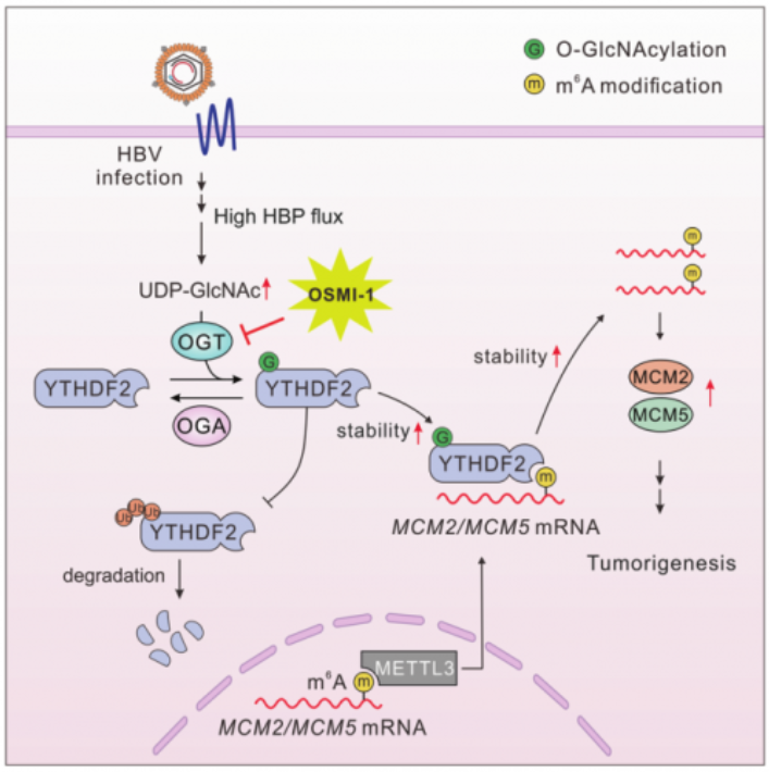 在机制上,YTHDF2以m6A依赖的方式稳定了小染色体维持蛋白2 (MCM2)和MCM5转录本,从而促进细胞周期进展和HBV相关的HCC肿瘤发生。此外,通过OGT抑制剂OSMI-1靶向YTHDF2 O-GlcNAcylation可显著抑制HCC进展。综上所述,该研究结果揭示了YTHDF2的一种新的调控机制,并强调了YTHDF2 O-GlcNA酰化在RNA m6A甲基化和HCC进展中的重要作用。分子途径的进一步描述有可能产生抑制HBV感染引起的HCC进展的治疗靶点。