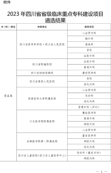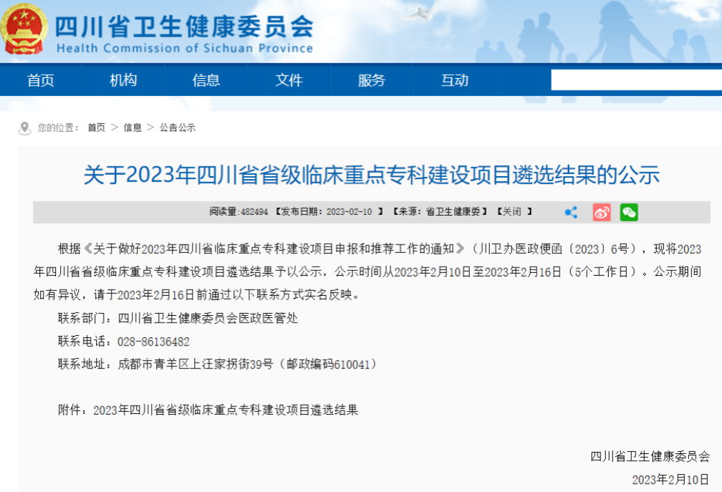 根据《关于做好2023年四川省临床重点专科建设项目申报和推荐工作的通知》(川卫办医政便函〔2023〕6号),2月10日,四川省卫健委发布《关于2023年四川省省级临床重点专科建设项目遴选结果的公示》,公示时间从2023年2月10日至2023年2月16日(5个工作日)。