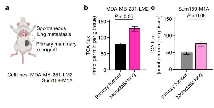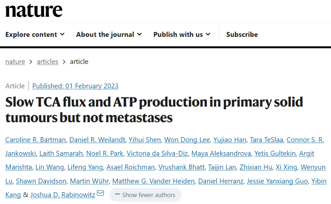 该研究于2023年2月1日以: Slow TCA flux and ATP production in primary solid tumours but not metastases 为题,发表于 Nature 期刊。