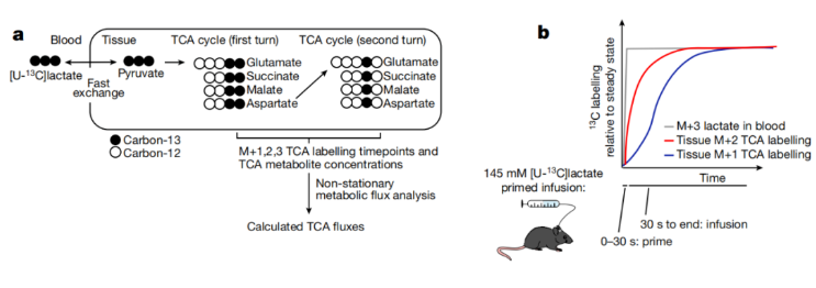 在上世纪20年代,德国生理学家 Otto Warburg 发现,肿瘤比其他组织表现出更多的糖酵解作用,即使是在氧气存在的情况下 也是如此,这个现象也被称为Warburg效应。 那么,为什么肿瘤细胞要抛开高效产能的线粒体有氧呼吸,而选择更低效的糖酵解代谢呢?难道真的“有钱就是任性”? 在这项最新研究中,研究团队开发并验证了一种测量小鼠正常组织和肿瘤组织中线粒体三羧酸循环 (TCA循环) 通量的策略,即注射同位素示踪剂,再通过质谱和由此产生的代谢物标记数据进行定量建模,以此跟踪正常组织和肿瘤组织的代谢速率。