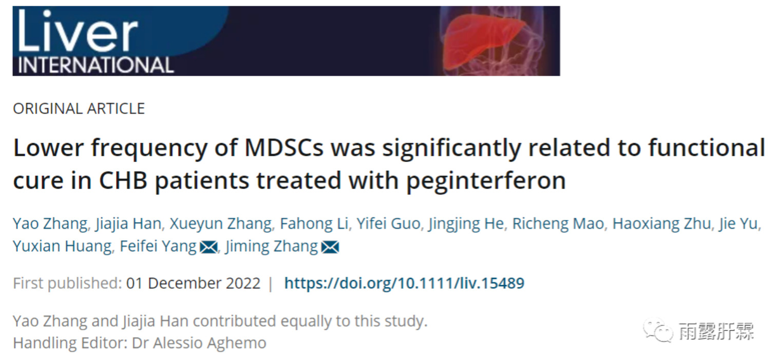 Zhang Y, Han J, Zhang X, et al. Lower frequency of MDSCs was significantly related to functional cure in CHB patients treated with peginterferon[J]. Liver Int, 2022, 43(2):329-339.