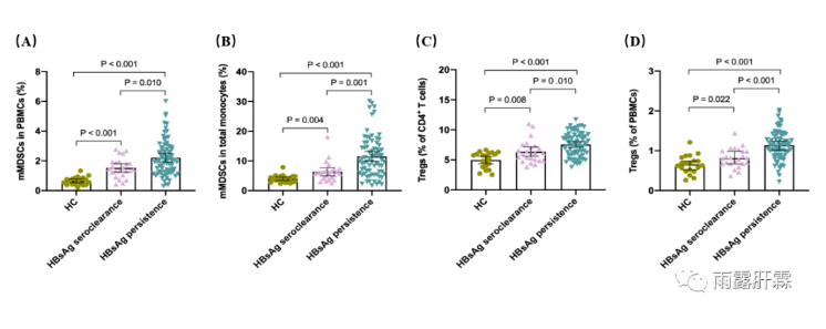 01 相比于健康人群,慢乙肝患者的基线mMDSCs和CD4+ Treg细胞的比例显著更高,其中HBsAg持续阳性组中比例最高