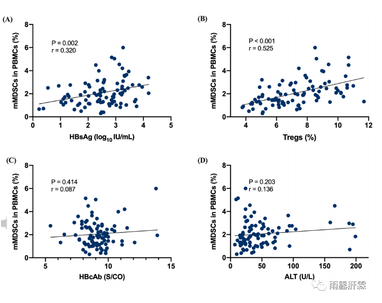 (A)PBMCs中mMDSCs比例与HBsAg水平、(B)CD4+ Tregs频率、(C)HBcAb水和(D)ALT水平之间的相关性