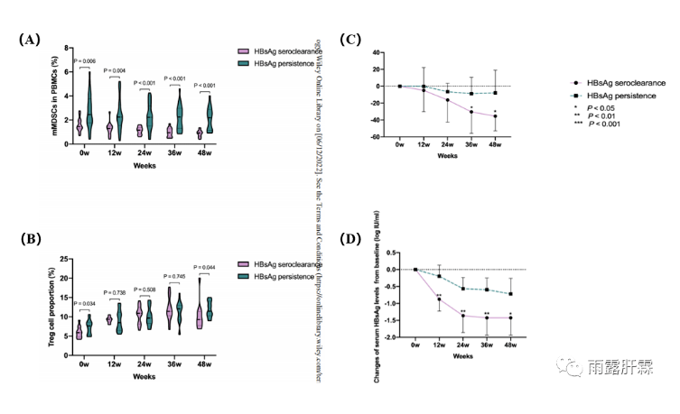 HBsAg清除患者和未清除患者相比,从基线到随访12、24、36和48周mMDSCs的中位变化百分比分别为-4.86% vs -0.09%(P = 0.704),-16.31% vs -6.50%(P = 0.129),-30.36% vs -8.81%(P = 0.032),-35.46% vs -7.88%(P = 0.037)。36和48周时,两组间的mMDSCs频率较基线的变化水平有显著差异(图C)。