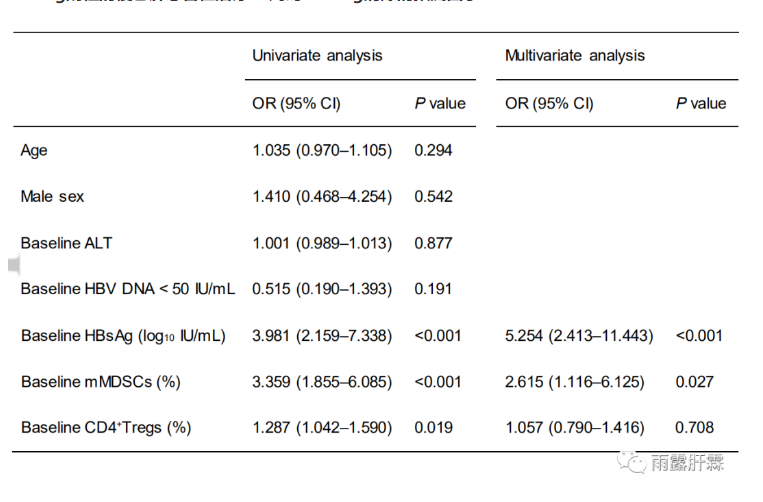 多因素分析表明,基线HBsAg(OR = 5.25;P < 0.001)和mMDSCs频率(OR = 2.62;P = 0.027)是HBsAg清除的独立预测因素。