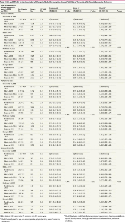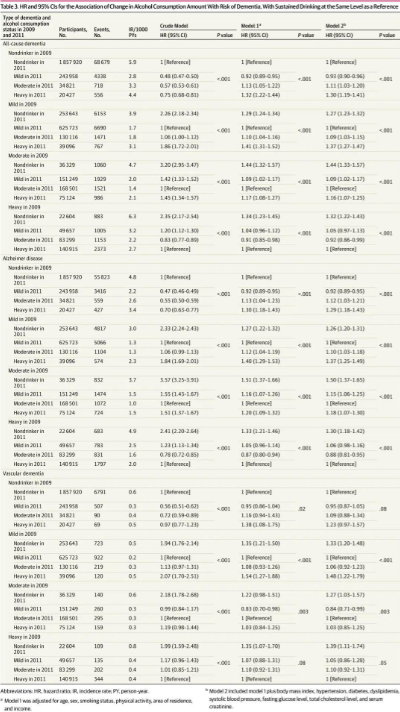 在该研究中,研究人员使用具有代表性的韩国人口的大样本评估了酒精消费综合变化模式与按初始饮酒量分层的痴呆风险之间的关联。与此同时,研究人员将饮酒水平分为无(每天0克),轻度(每天<15克),中度(每天15-29.9克)和重度(每天≥30克)。根据2009年至2011年酒精消费水平的变化,参与者分为以下几组:不饮酒者,戒烟者,减少者,维持者和增加者。
