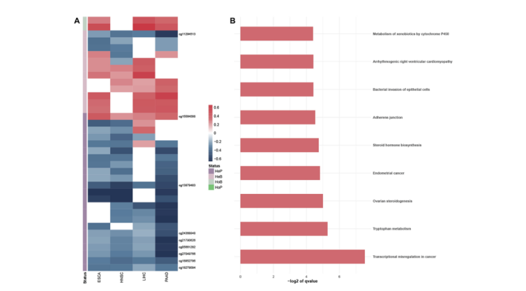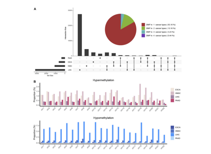 研究者在四种癌症中鉴定了一组DMPs, ESCA中有6436个,HNSCC中有10891个,LIHC中有31620个,PAAD患者中有3592个(图1A),并测量了每个正常染色体上高甲基化或低甲基化DMPs在该区域所有探针上的分布比例(图1B)。