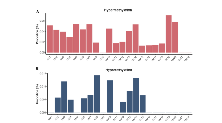 图3:高甲基化(A)和低甲基化(B) PDMPs在染色体中的比例