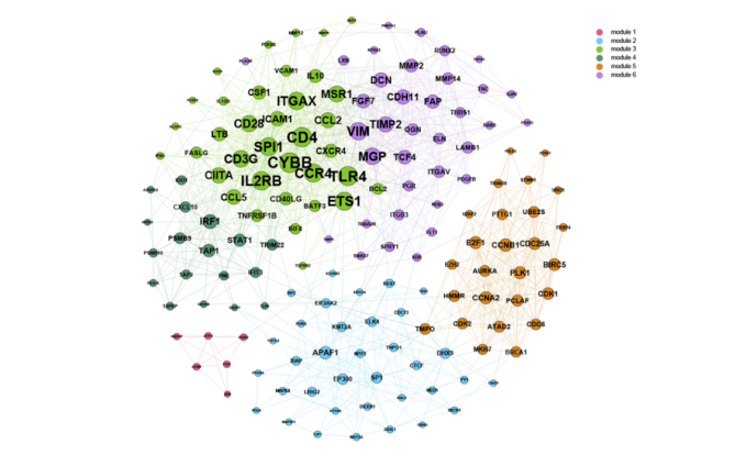 基于PDMPs生成的500 bp序列,扫描、富集可能的tf结合基序,并将其分为高甲基化组和低甲基化组。分别鉴定出33个和7个位于高甲基化和低甲基化区域的基序,然后用STAMP将这些基序分组为5个簇。(图6)。所有7个低甲基化基序都具有密切的亲缘关系,并聚为一组,这表明它们之间存在类似的调节机制。簇I在细胞周期中显著富集,簇IV与调节干细胞多能性的信号通路相关。簇IV与IL-17信号通路和TNF信号通路有关,可能参与了免疫应答的调节。根据trust数据库,研究者进一步探索了与上述TF基序相关的靶基因,构建了一个转录调控网络,该网络被识别为六个不同的模块(图7)。