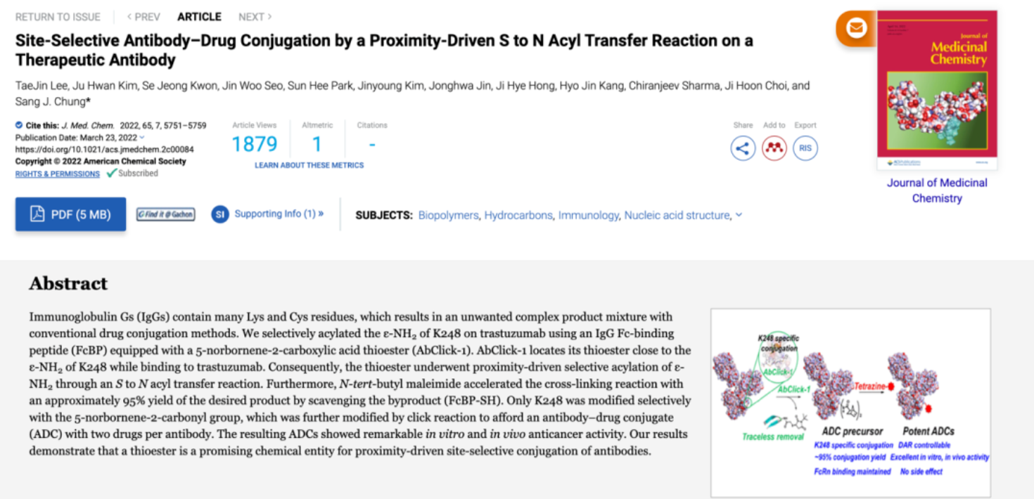 第一位发言的是来自韩国Aptis公司的金博士(Joo-Hwan Kim),演讲主题为:新一代抗体-药物偶联(ADC)技术抗体结合位点的选择性结合。内容主要是基于已发表的论文:通过邻近驱动的S到N酰基转移反应对治疗性抗体进行位点选择性抗体-药物偶联。