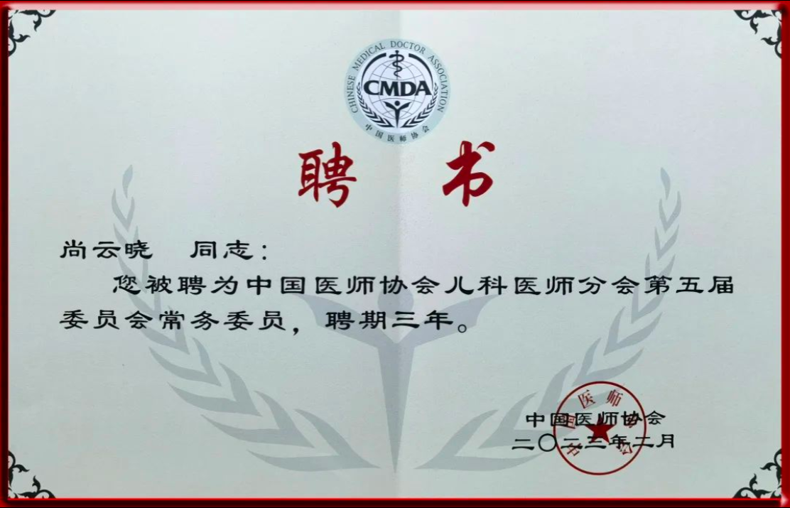 在2023年中国医师协会儿科医师分会第五届委员会换届会议上,医院小儿内科主任刘春峰当选为副会长、小儿内科副主任尚云晓当选为常务委员。