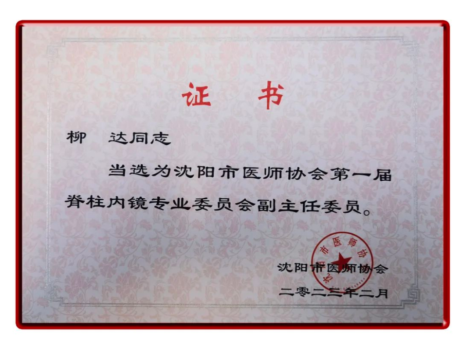 第六骨科脊柱微创外科、创伤骨科病房主任柳达当选为沈阳市医师协会第一届脊柱内镜专业委员会副主任委员。