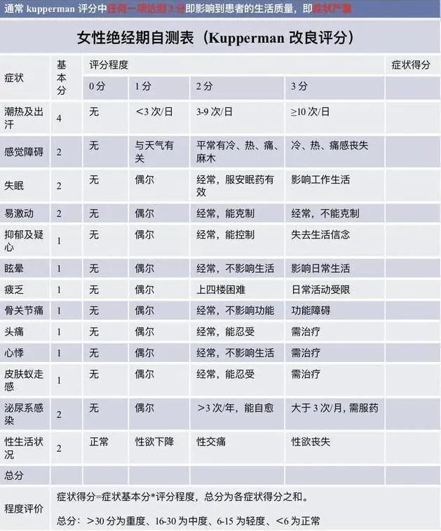 如何判断自己是否进入更年期,可以对照(下图表格)看看,若超过6分或说明可能进入更年期。